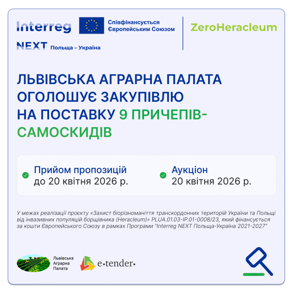 Львівська Аграрна палата оголосила закупівлю UA-2026-03-18-013635-a, яка передбачає поставку дев’яти причепів-самоскидів для підвищення технічної спроможності комунальних підприємств дев’яти територіальних громад Львівської області з метою забезпечення ефективного виконання робіт із механічного знищення борщівника Сосновського у межах реалізації проєкту «Захист біорізноманіття транскордонних територій України та Польщі від інвазійних популяцій борщівника (Heracleum)» PLUA.01.03-IP.01-0008/23, що фінансується Європейським Союзом у рамках Програми “Interreg NEXT Польща–Україна 2021–2027” згідно коду ДК 021:2015 — 34220000-5 — Причепи, напівпричепи та пересувні контейнери, на електронному майданчику E-Tender.