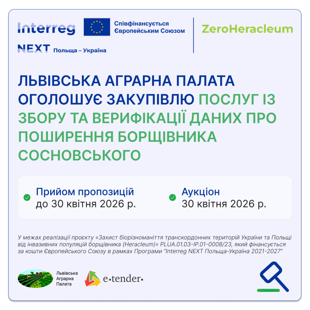 Львівська Аграрна палата оголосила закупівлю UA-2026-03-30-008908-a, яка передбачає закупівля послуг із збору та верифікації даних про поширення борщівника Сосновського (Heracleum sosnowskyi) на території Львівської області з метою формування бази геопросторових даних, картування популяцій та підготовки інформації для подальшого аналізу і моделювання у межах реалізації проєкту «Захист біорізноманіття транскордонних територій України та Польщі від інвазійних популяцій борщівника (Heracleum)» ZeroHeracleum PLUA.01.03-IP.01-0008/23, що фінансується Європейським Союзом у рамках Програми “Interreg NEXT Польща–Україна 2021–2027” згідно коду ДК 021:2015 — 90740000-6 — Послуги з відстеження, моніторингу забруднювачів і відновлення, на електронному майданчику E-Tender.