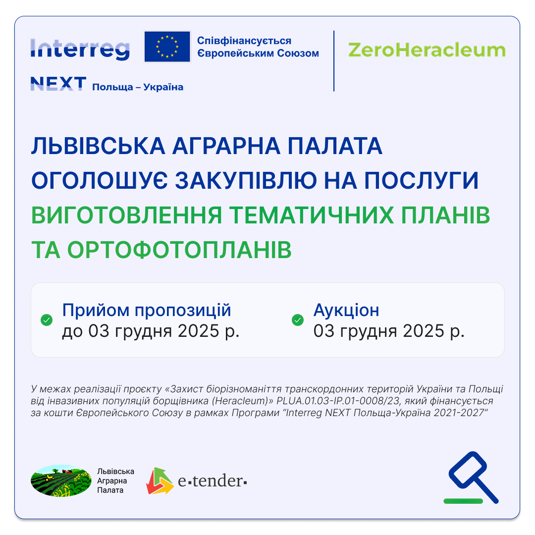 ЛЬВІВСЬКА АГРАРНА ПАЛАТА ОГОЛОСИЛА ЗАКУПІВЛЮ У МЕЖАХ РЕАЛІЗАЦІЇ ПРОЄКТУ «ЗАХИСТ БІОРІЗНОМАНІТТЯ ТРАНСКОРДОННИХ ТЕРИТОРІЙ УКРАЇНИ ТА ПОЛЬЩІ ВІД ІНВАЗІЙНИХ ПОПУЛЯЦІЙ БОРЩІВНИКА (HERACLEUM)» PLUA.01.03-IP.01-0008/23, ЯКИЙ ФІНАНСУЄТЬСЯ ЗА КОШТИ ЄВРОПЕЙСЬКОГО СОЮЗУ В РАМКАХ ПРОГРАМИ “INTERREG NEXT ПОЛЬЩА-УКРАЇНА 2021-2027”