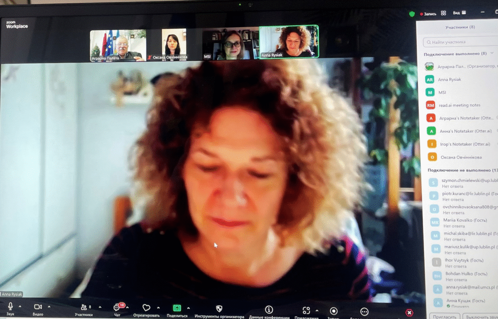 Виступили партнери проєкту: від Львівського національного університету ветеринарної медицини та біотехнологій імені С. З. Ґжицького- керівник проєкту Оксана Овчіннікова. Вона доповіла про вже виконану роботу та окреслила наступні кроки. Університет Марії Кюрі-Склодовської (Люблін, Польща) представляла Анна Рисяк. Вона повідомила, що цього року вдалося закупити частину обладнання, розпочати досліди з випасання овець та великої рогатої худоби, а також відібрати зразки борщівника на відповідних територіях у Польщі. До зустрічі також долучилися Університет природничих наук у Любліні та Люблінська Аграрна палата, які підтвердили готовність до активної співпраці у наступних етапах реалізації проєкту.